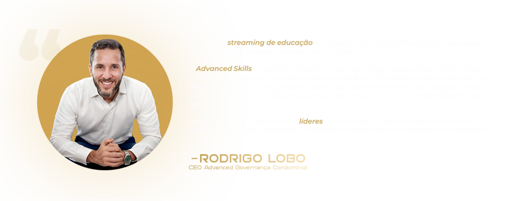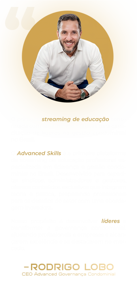 O Advanced Skills é a plataforma de aprendizado mais completa para síndicos, administradores e gestores condominiais. Nossa missão é capacitar profissionais com um conteúdo atualizado, prático e aplicado ao mercado real, trazendo uma experiência de ensino dinâmica, com aulas ministradas por especialistas reconhecidos no setor.